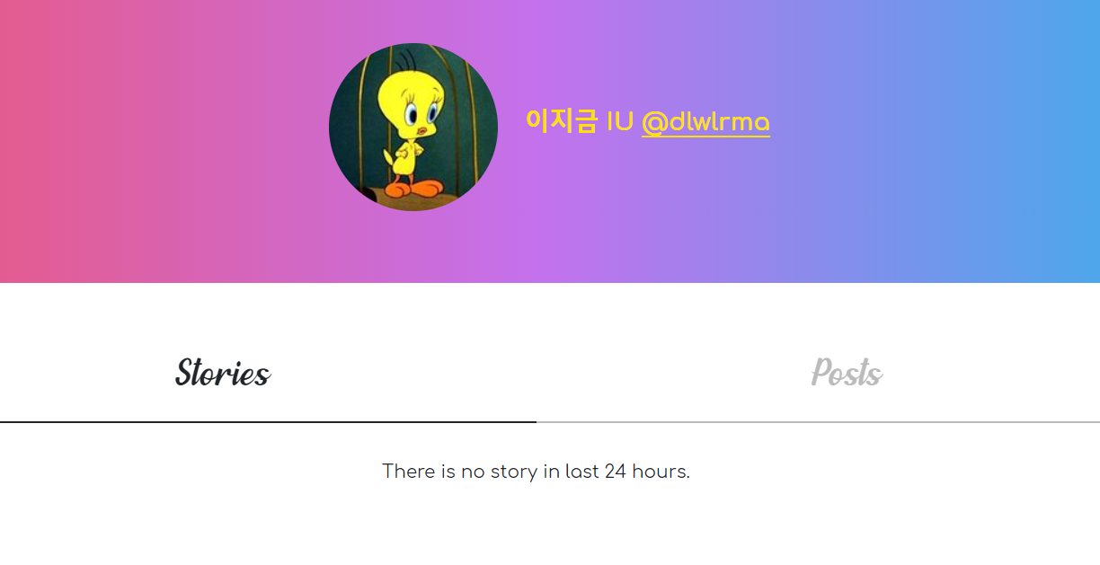 검색해서 나오는 아이디를 클릭하면 하단 왼쪽에는 스토리, 오른쪽에는 게시물이 표시가 됩니다. 스토리에 올린 게시물이 없을 경우에는 없다는 안내가 나오고 , 포스트에는 게시물을 확인할수가 있습니다.